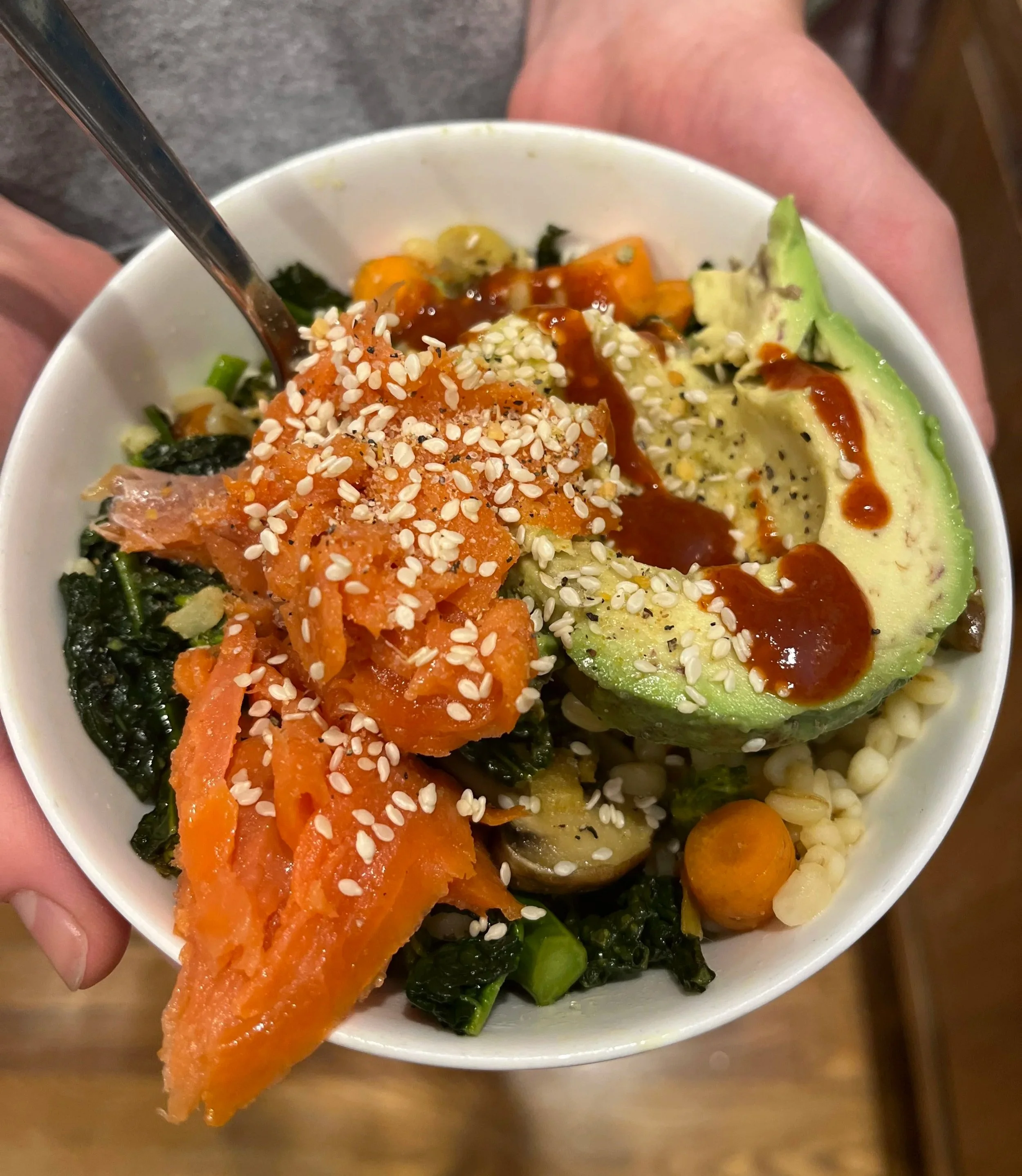 Bulguria, pannulla paistettuja vihanneksia, graavilohta ja avokadoa