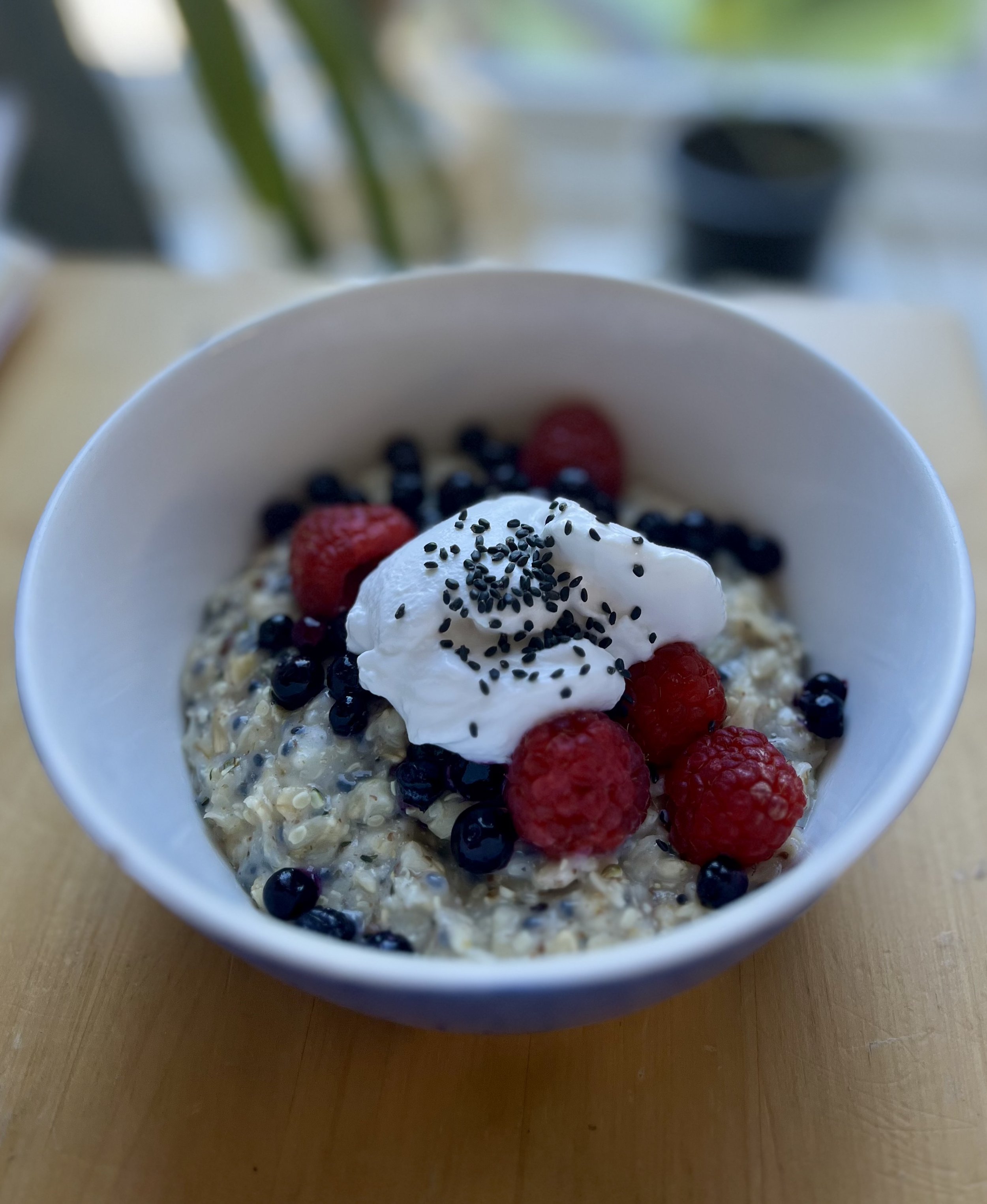 kaurapuuro siemenillä, marjoilla ja jogurtilla