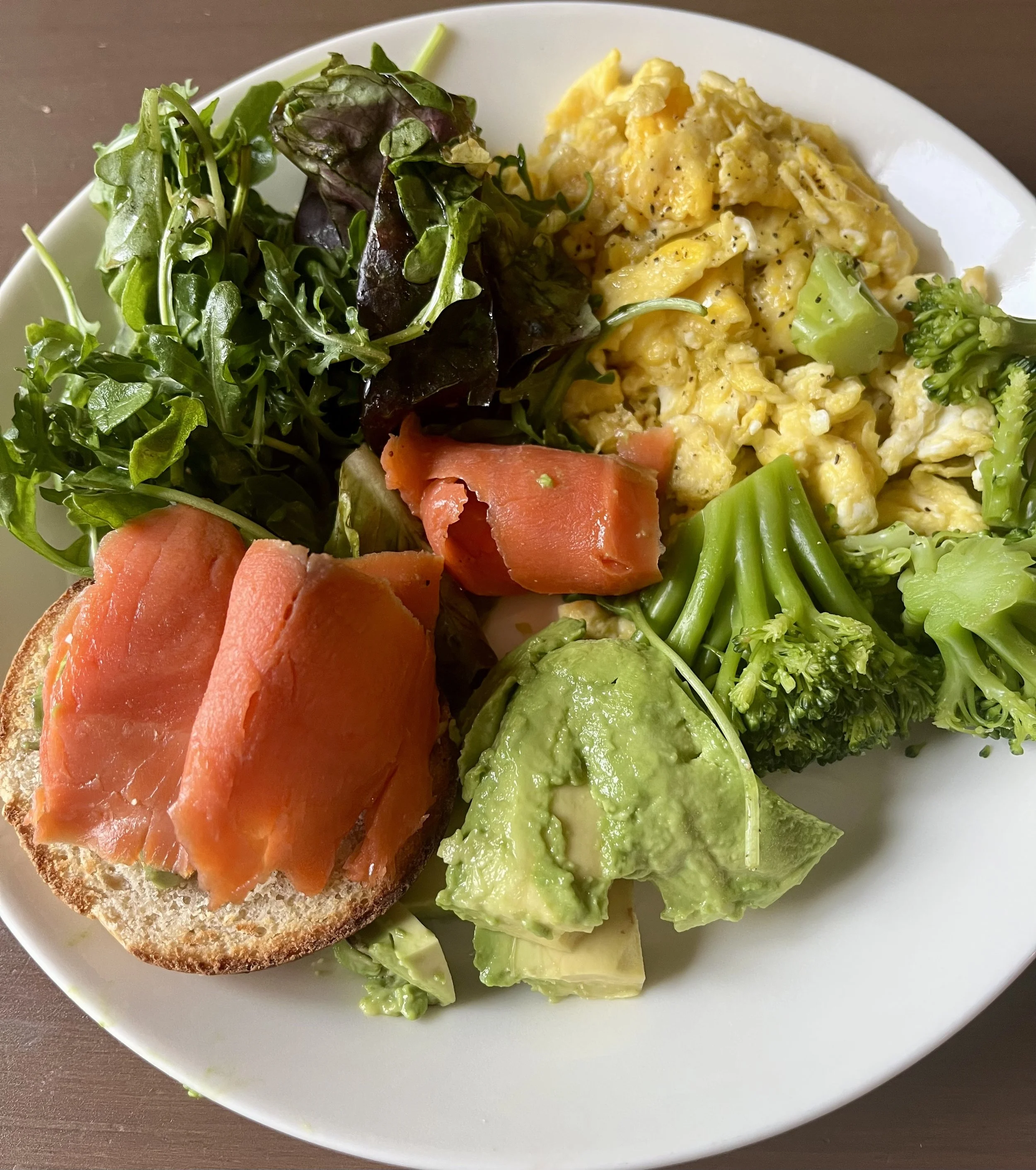 kananmuna, leipä, lohi, avokado ja salaatti